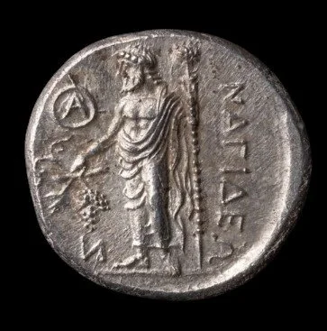This silver stater from Nagidos, struck about 2,415 years ago, depicts Dionysus on one side and Aphrodite on the other—symbols of prosperity, beauty, and cultural pride from this thriving Cilician port city..