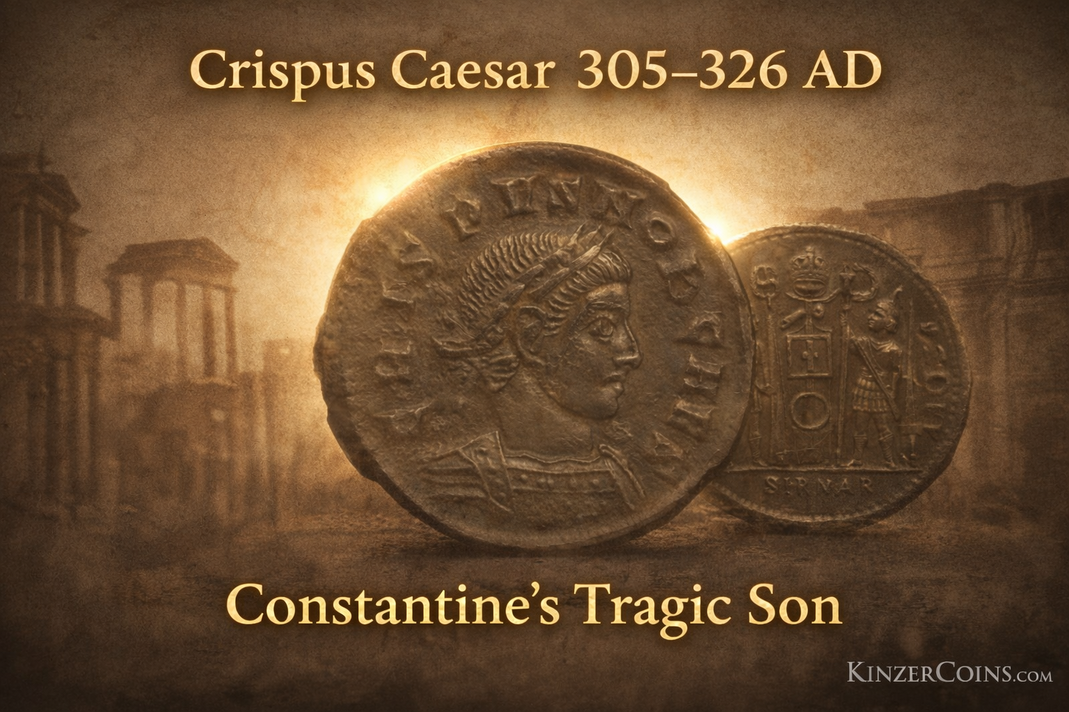 Authentic Roman bronze coin of Crispus Caesar (AD 305–326), NGC certified, shown in a cinematic historical thumbnail with parchment background and Roman ruins.